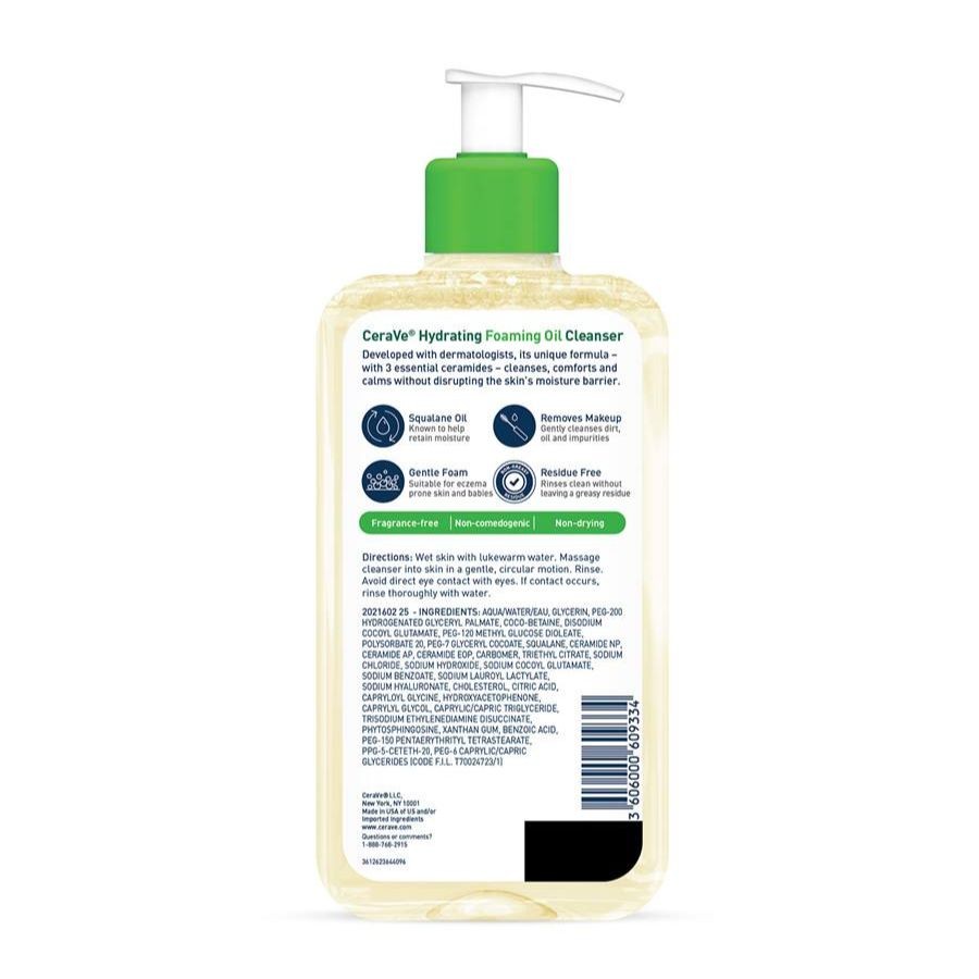 Developed with Dermatologists, CeraVe Hydrating Foaming Oil Cleanser is a unique foaming oil formula that gently cleanses, hydrates, and soothes skin without disrupting the natural protective skin barrier. This formula combines two skin-replenishing oils to help replenish skin's natural moisture and three essential ceramides (1, 3, 6-II) to help maintain skin's protective barrier. This formula is suitable for normal to very dry skin, baby skin and allergy-prone skin.