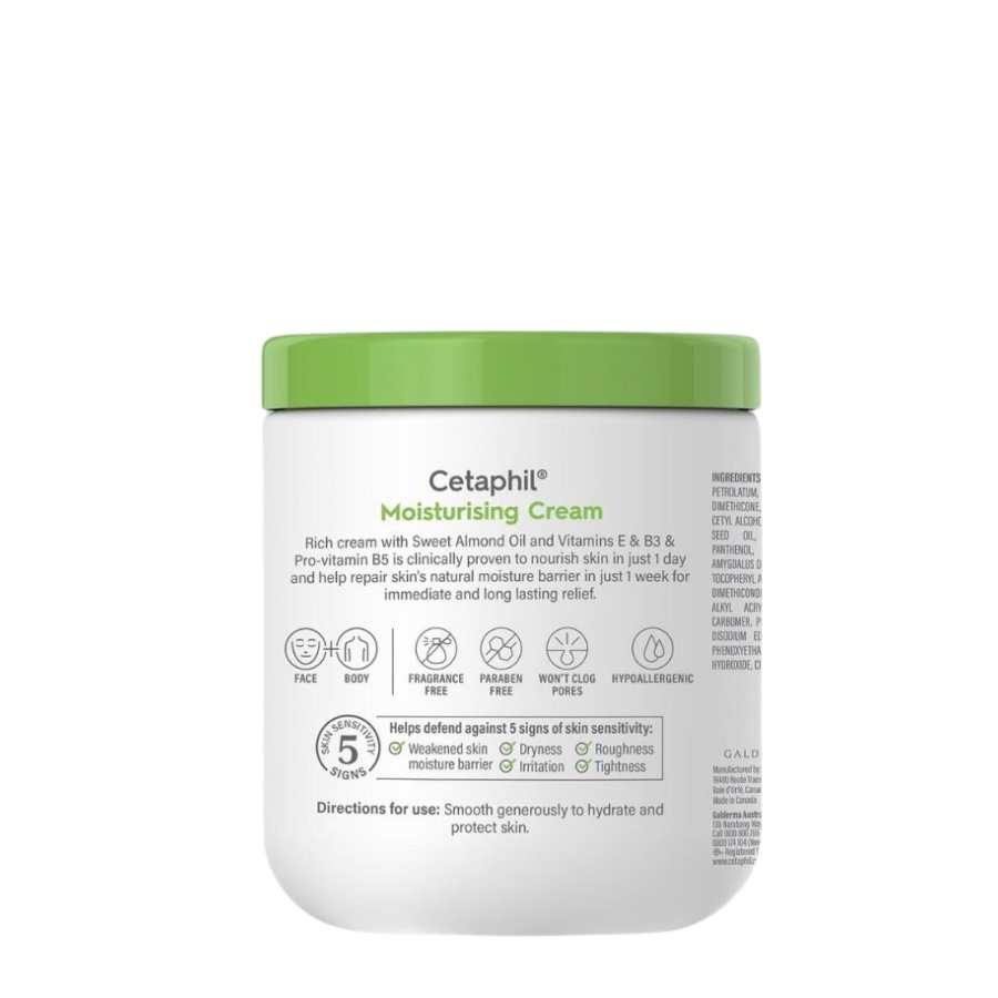Enriched with sweet almond oil and vitamin E, Cetaphil Moisturising Cream intensely hydrates for 48 hours to help restore your skin's moisture barrier. This rich and nourishing moisturiser is ideal for dry to very dry, sensitive skin.