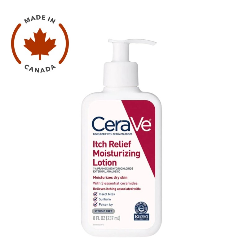 CeraVe Itch Relief Moisturizing Lotion is formulated with 1% Pramoxine Hydrochloride to provide temporary relief associated with minor skin irritations, insect bites, sunburn and scrapes. Developed with dermatologists, this clinically tested steroid-free anti-itch lotion is suitable for all skin types, including sensitive. Fragrance-free and non-irritating, this itch relief moisturizing lotion contains three essential Ceramides and Hyaluronic Acid to help restore the skin’s barrier and retain hydration.